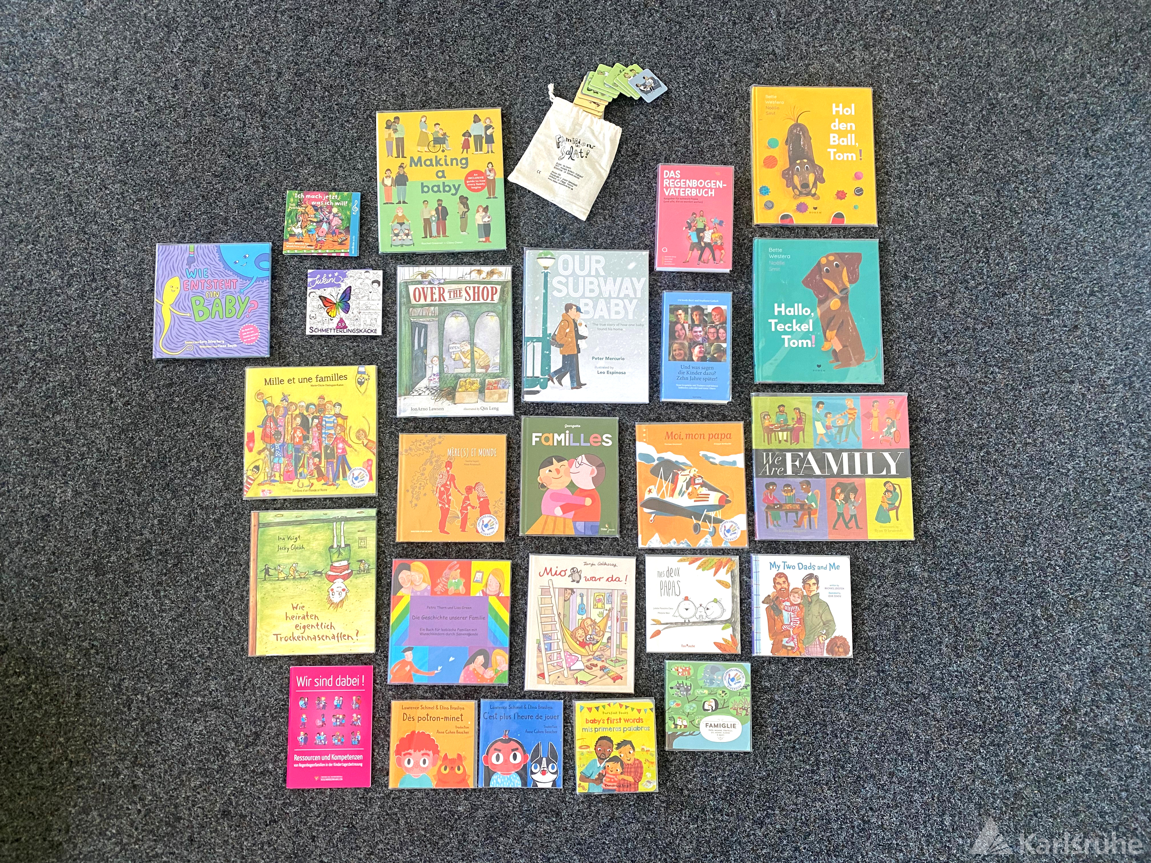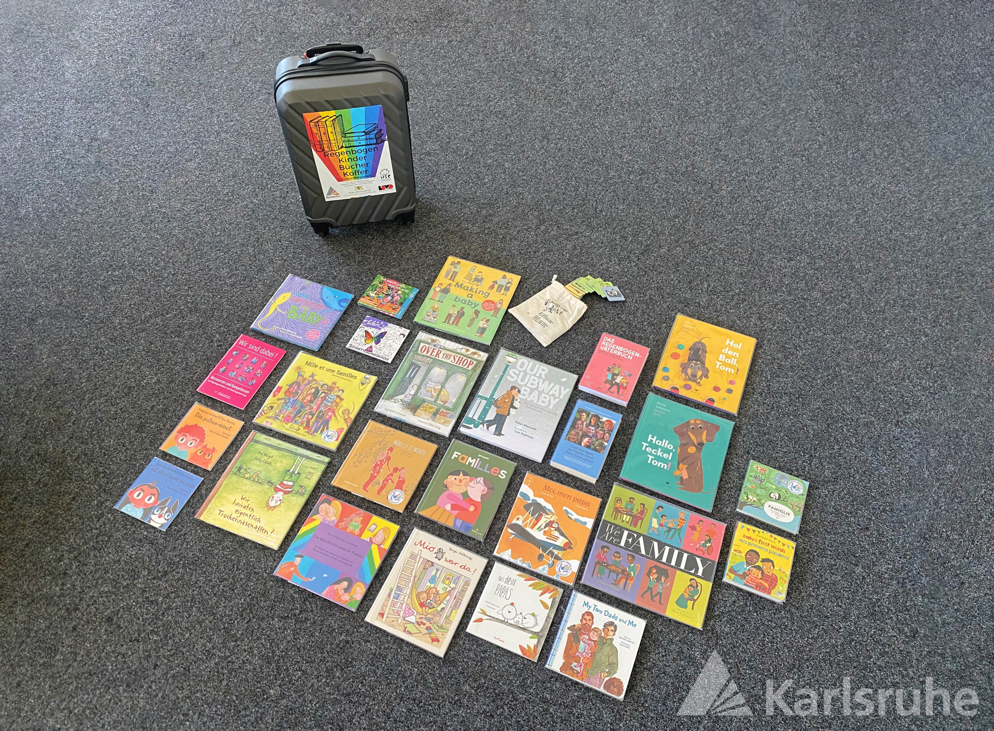 - Ein Koffer richtet sich inhaltlich an Kinder im Grundschulalter und enthält Vorlese-, Selbstlese und Sachbücher, CDs und eine Zeitschrift zu den Themen Regenbogenfamilien und anderen queeren Themen. Außerdem sind darin ausgewählte Fachliteratur für Lehrkräfte und Pädagog*innen mit Anregungen zur Unterrichtsgestaltung enthalten. Dieser Koffer wurde in Zusammenarbeit mit der Stadt durch das baden-württembergische Sozialministerium realisiert.